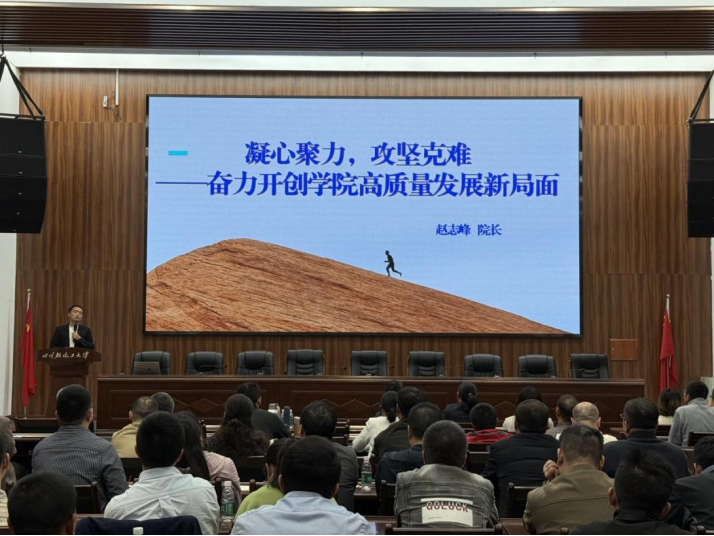 随后赵志峰院长以“凝心聚力,攻坚克难——奋力开创学院高质量发展新局面”为主题,对学院2025年下半年工作作出了周密部署,号召全体教职工进一步统一思想、凝聚共识,在人才培养、科学研究和社会服务等领域持续发力,为推动学院高质量发展贡献力量。