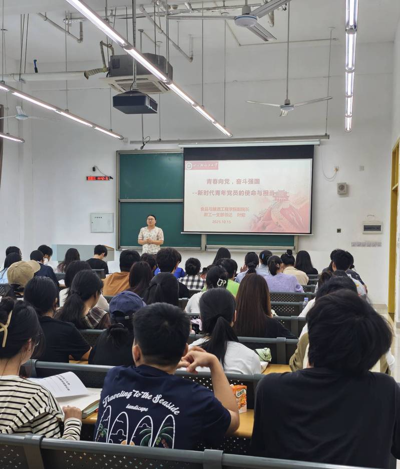 为加强党员发展对象的教育培养,10月15日下午,食品与酿酒工程学院党委在宜宾校区A10-120组织开展了青春向党,奋斗强国主题党课。学院副院长叶阳教授担任主讲,全体发展对象参加学习。